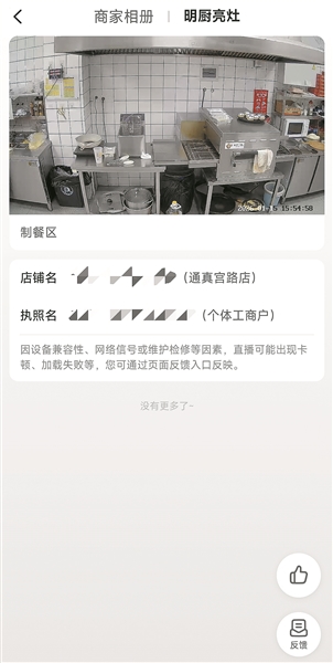 這種現象并非個例。記者在嶗山區高云路附近打開美團外賣App,進入平臺設置的“明廚亮灶”專區看到,周邊有90余家外賣餐飲店開通了該功能。其中,超過一半商家的攝像頭畫面覆蓋餐飲食品加工制作的關鍵過程,并正常運轉;另有近三分之一的商家雖開通直播功能,但有的攝像頭未對準食品加工區,有的呈黑屏、花屏或“畫面丟失”狀態,看不到食材加工過程。