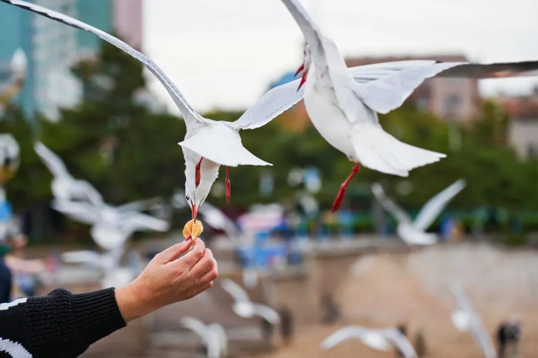 也擋不住人們喂海鷗的熱情,