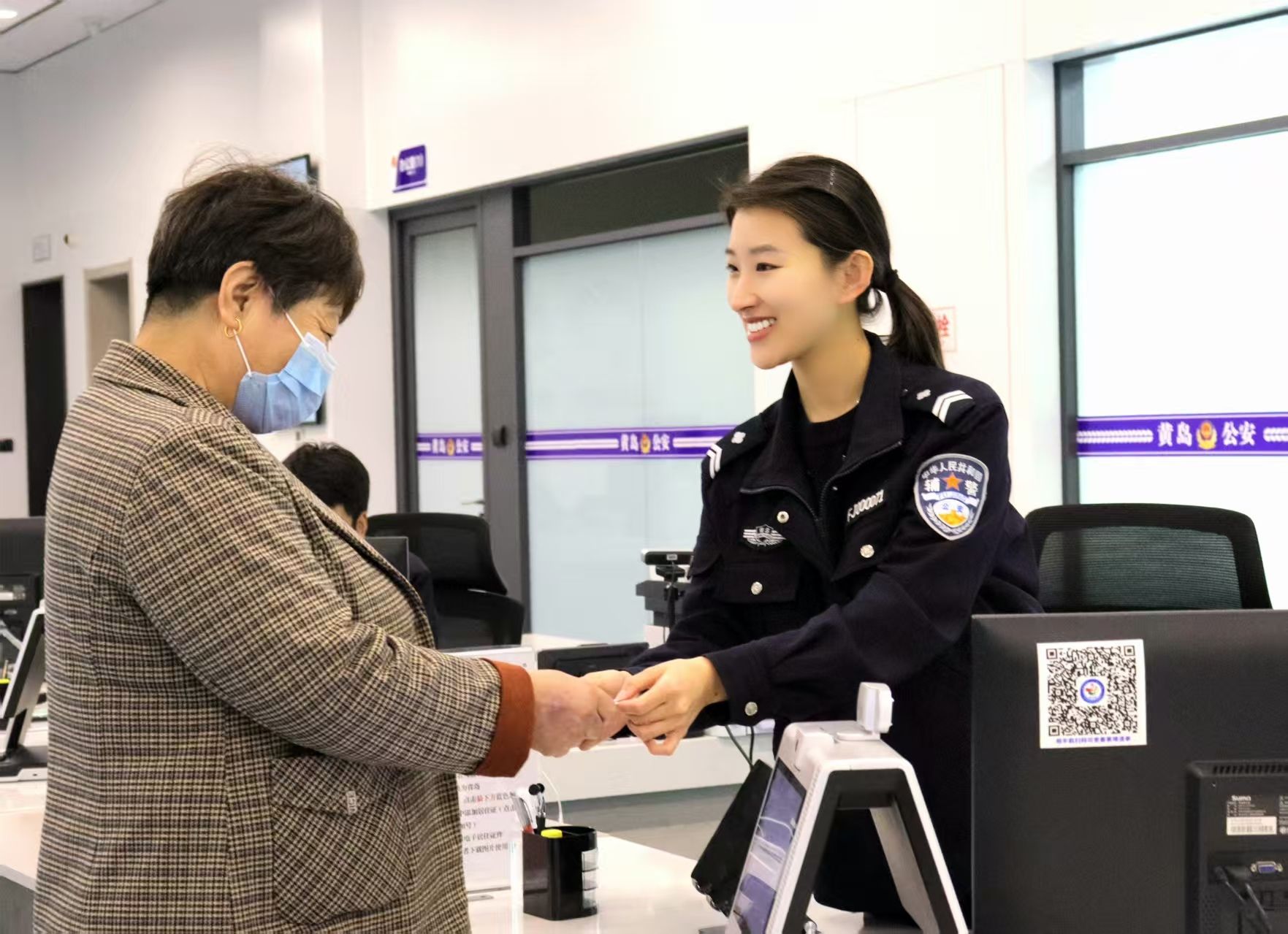 走進青島市公安局黃島分局政務(wù)服務(wù)中心大廳,身著藏藍警服的女警員面帶微笑,忙碌不已:有的在大廳里來回穿梭,為市民答疑解惑;有的在窗口前俯身傾聽,細心辦理各類業(yè)務(wù);有的在自助設(shè)備區(qū),手把手指導(dǎo)市民操作智能機器。