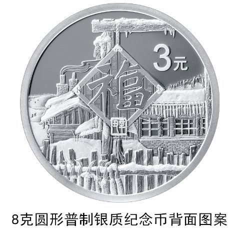 8克圓形銀質(zhì)紀念幣背面圖案為“福”字造型,襯以東北民居典型造型組合設計,并刊面額。