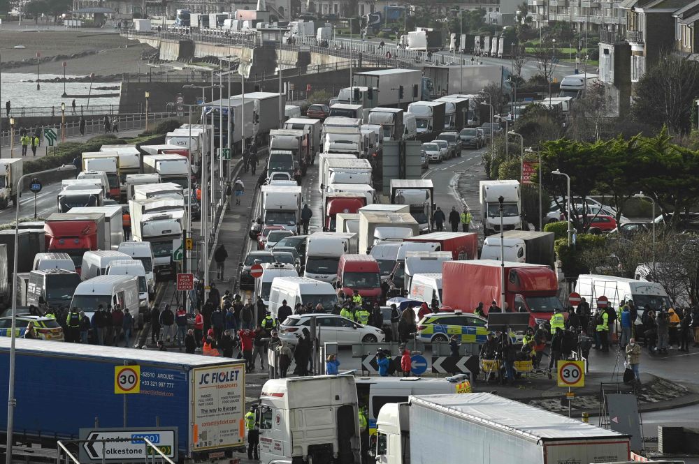 12月23日,在英國肯特郡多佛爾港,滯留的貨運卡車司機等候放行。(新華社/法新)