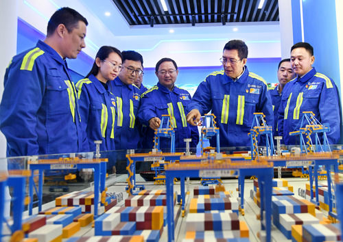 “連鋼創新團隊”成員在討論由山東港口青島港全球首創的集裝箱智能空軌集疏運系統方案。