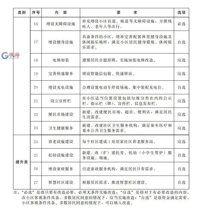 ? “完善類”主要包括完善社區(qū)和物業(yè)服務(wù)用房、公安警務(wù)用房、智能信包箱和文化、體育健身、無障礙、衛(wèi)生健康、交通安全設(shè)施,實(shí)施建筑節(jié)能改造、海綿化改造、加裝電梯、停車場建設(shè)等;