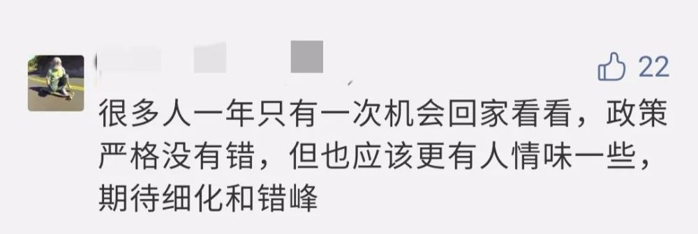 隨著購票政策的調(diào)整,春節(jié)能不能回家這一問題引發(fā)網(wǎng)民熱議,“理解疫情防控難處,但還是很想回家過年”“到底要不要買票回家,還在糾結(jié)中”“各地防疫措施不一樣,想知道回家需不需要核酸檢測(cè),需不需要隔離”,也有網(wǎng)民提出“選擇‘就地過年’,對(duì)自己負(fù)責(zé),對(duì)家人負(fù)責(zé)”。