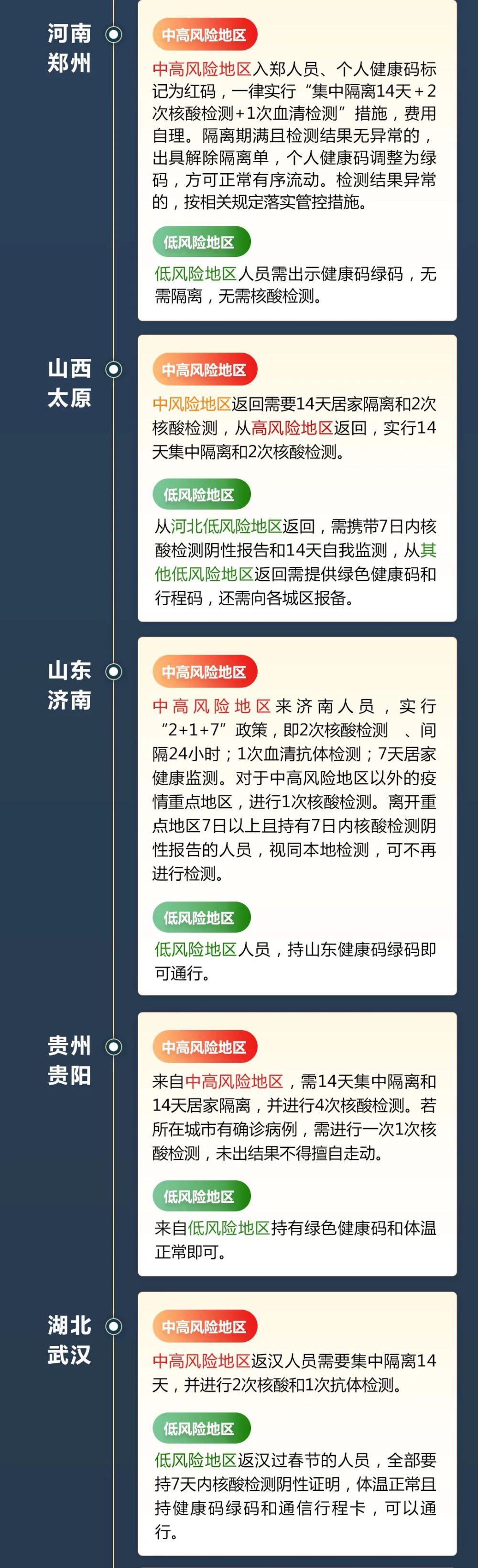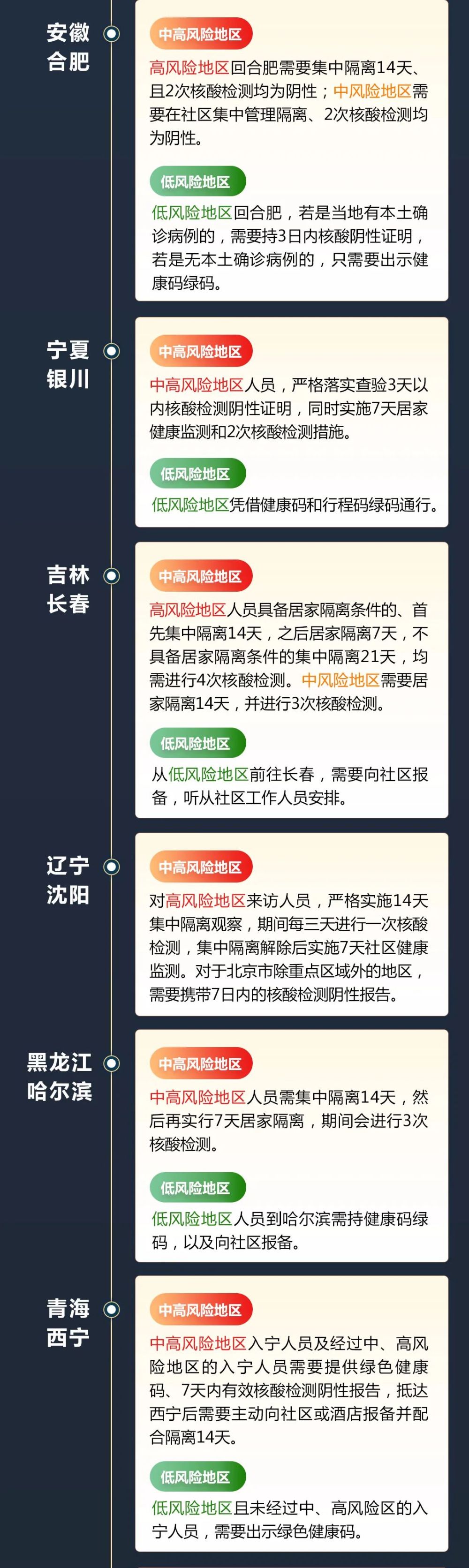 目前,全國31省區(qū)市均出臺(tái)了返鄉(xiāng)隔離政策。各地政策有一定區(qū)別,但均要求中高風(fēng)險(xiǎn)區(qū)返鄉(xiāng)人員接受隔離,同時(shí)進(jìn)行核酸檢測(cè)。