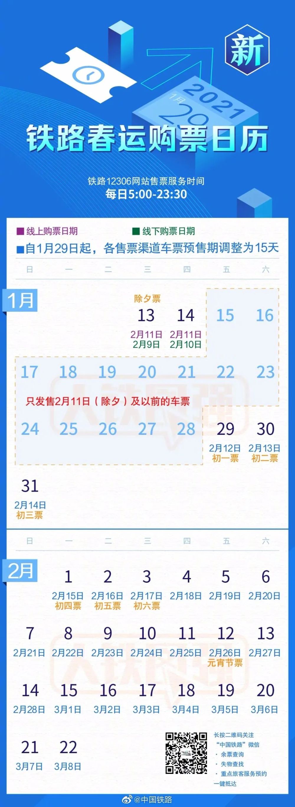 自發(fā)售2021年2月12日(正月初一)車票起,鐵路車票預(yù)售期調(diào)整為15天。調(diào)整后,從1月29日起售2021年2月12日(正月初一)車票。1月14日至1月28日,只發(fā)售2月11日(除夕)及以前的車票。