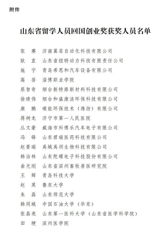 近年來,全省廣大留學回國人員以習近平新時代中國特色社會主義思想為指導,全面貫徹黨的十九大和十九屆二中、三中、四中、五中全會精神,堅決貫徹落實新發展理念,積極踐行社會主義核心價值觀,充分發揮自身優勢,擔當作為、奮力拼搏,服務疫情防控和經濟社會發展,為促進全省高質量發展作出了突出貢獻。為表彰先進,樹立典型,進一步激發廣大留學回國人員創新創業活力,省政府決定,授予濟南翼菲自動化科技有限公司張賽等19名優秀留學回國人員“山東省留學人員回國創業獎”稱號。