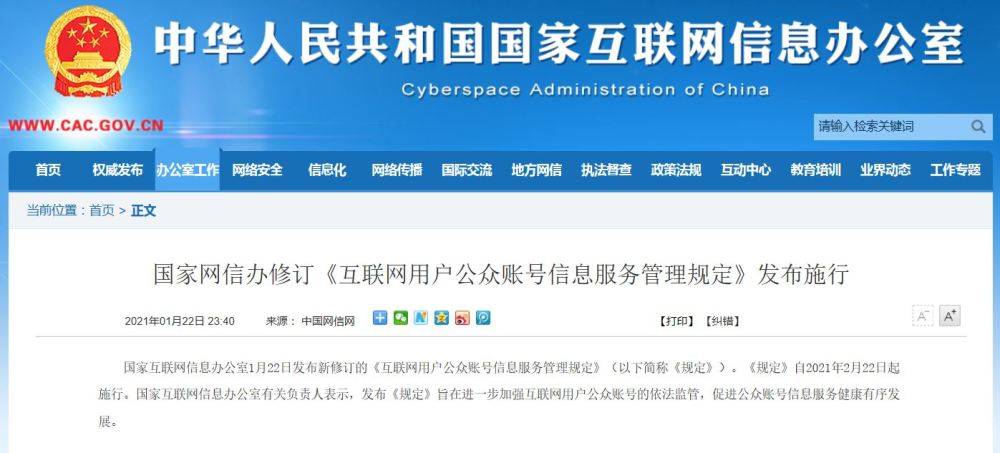 國家網信辦1月22日發布新修訂的《互聯網用戶公眾賬號信息服務管理規定》,自2月22日起施行,重點強調打擊虛假信息、虛假流量等違法違規行為。