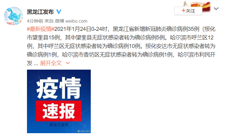 2021年1月24日0-24時,黑龍江省新增新冠肺炎確診病例35例(綏化市望奎縣15例,其中望奎縣無癥狀感染者轉為確診病例5例。哈爾濱市呼蘭區12例,其中呼蘭區無癥狀感染者轉為確診病例10例。綏化安達市無癥狀感染者轉為確診病例1例,哈爾濱市香坊區無癥狀感染者轉為確診病例1例,哈爾濱市利民開發區4例,綏化市北林區1例,哈爾濱市道外區1例)。新增無癥狀感染者20例(綏化市望奎縣2例,哈爾濱市呼蘭區11例,哈爾濱市利民開發區6例,哈爾濱市道里區1例)。