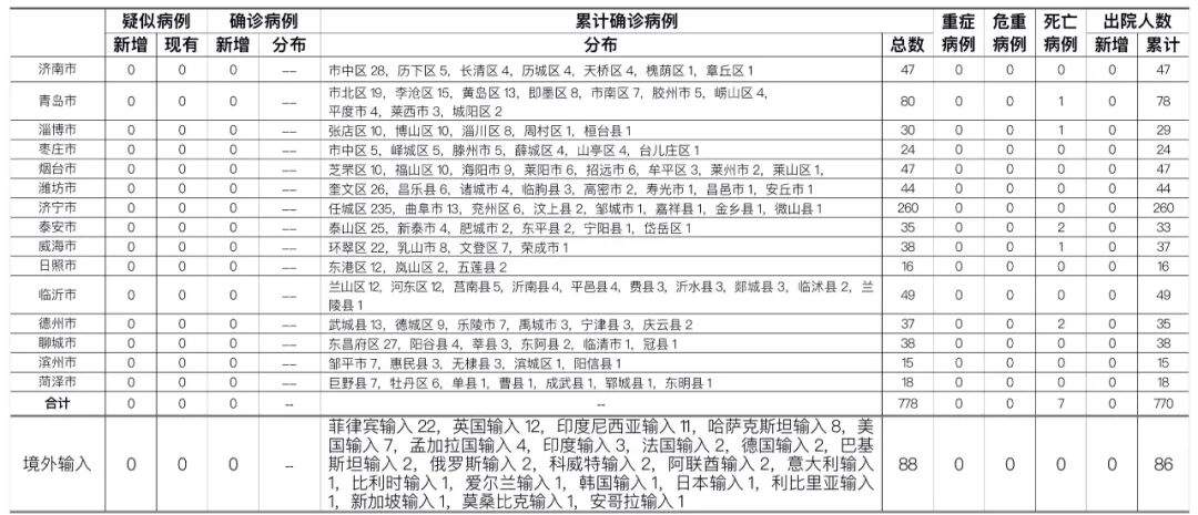 山東無新增本地疑似病例、確診病例。累計報告確診病例778例,死亡7例,治愈出院770例。正在住院治療的確診病例1例(省外輸入1例)。