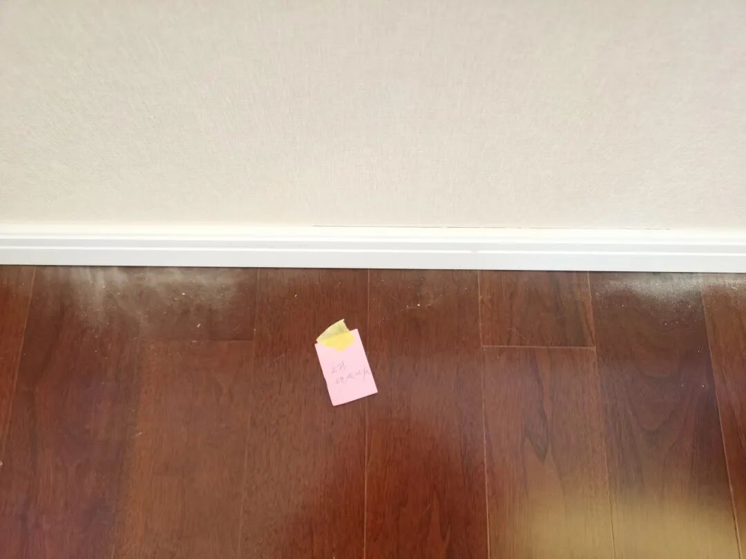 薛總監用直角尺和2米靠尺對方正度和平整度進行測量,房間開間、進深、層高各項均符合驗收標準。驗房師還發現臥室地板存在踏空 、吐灰現象,其中主臥尤為突出,驗房師沿著墻根在地面跺了一圈,灰蒙蒙的塵土從地板縫里鉆出來,相鄰的地板還存在踏空現象。“地面沒打掃出來鋪地板就會出現這個問題。”薛總監提醒魏先生。