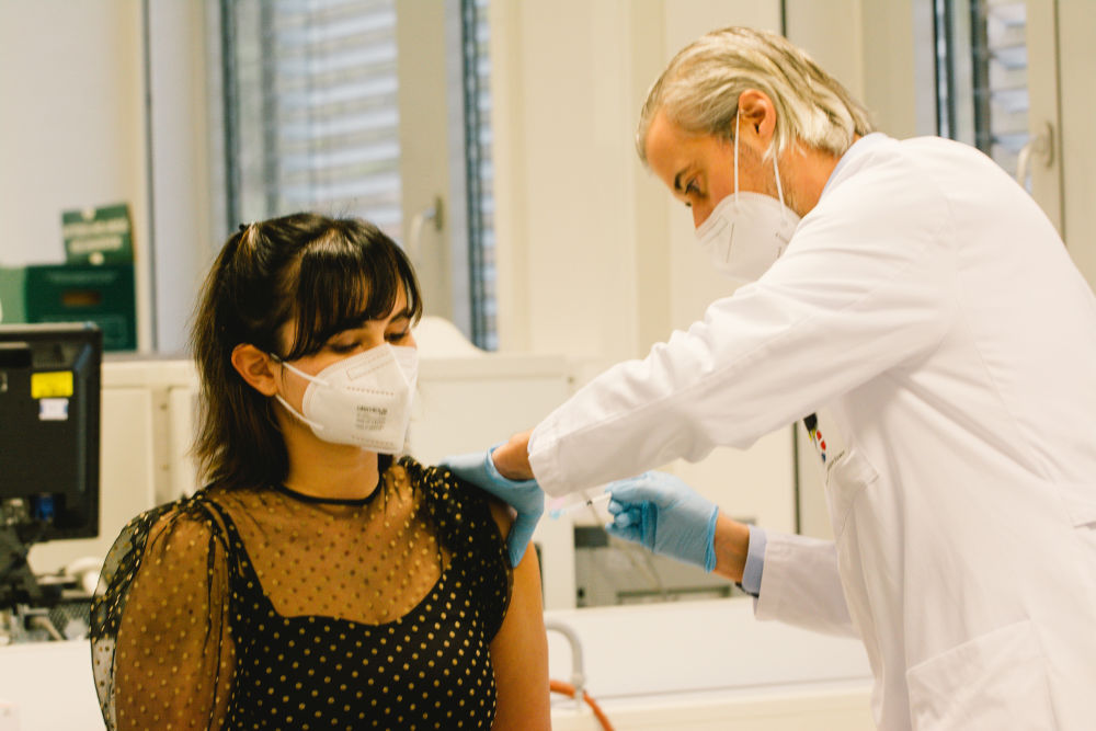 1月18日,在德國埃森大學醫學院,一名醫護人員(左)在接種新冠疫苗。(新華社發,唐穎攝)