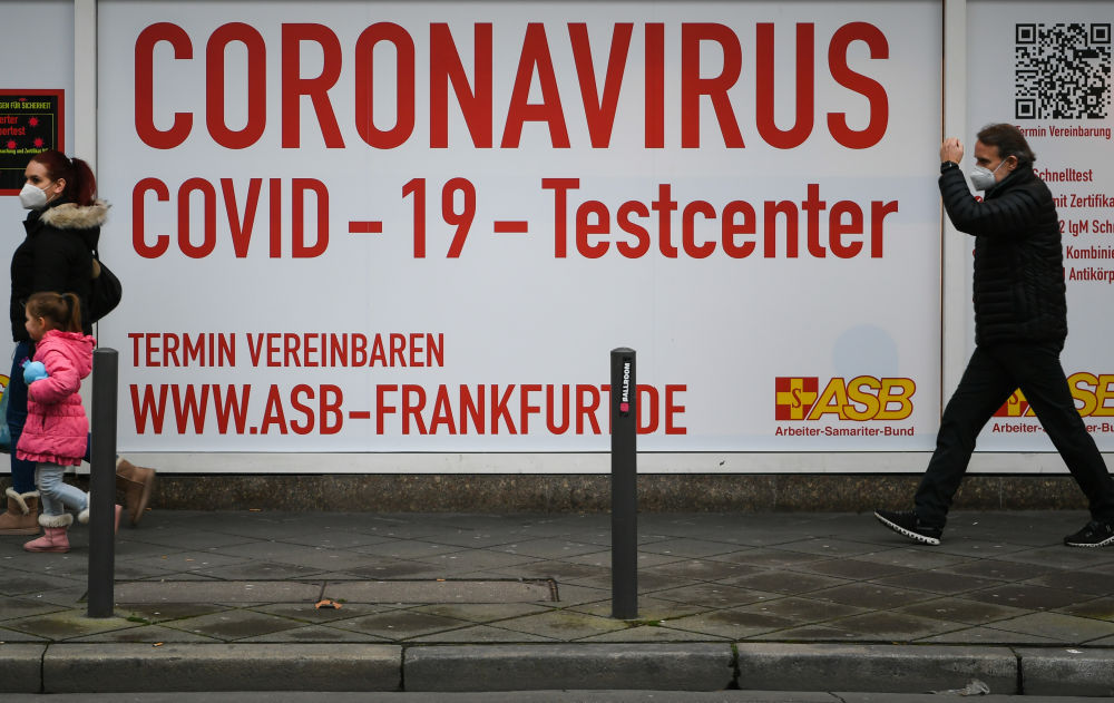 1月20日,在德國法蘭克福,戴口罩的行人從一處新冠病毒檢測中心外經過。(新華社記者逯陽攝)