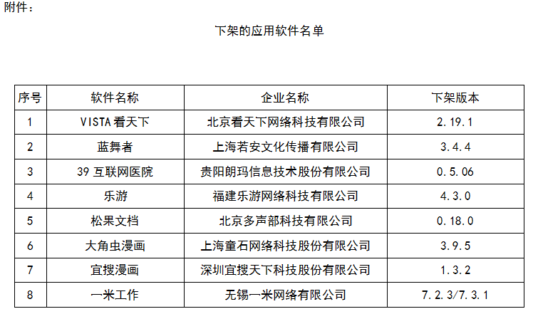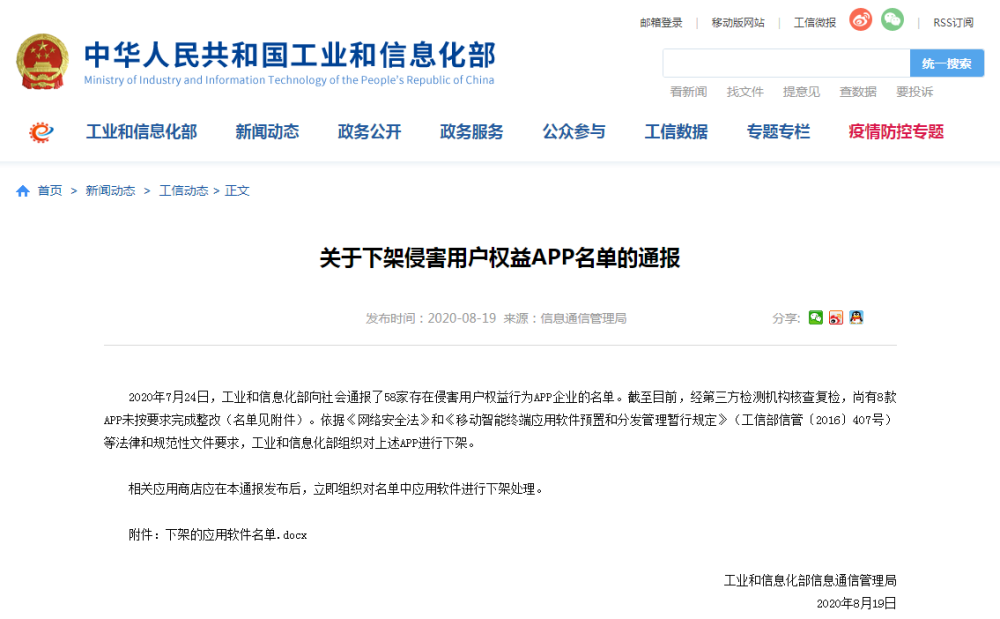 2020年7月24日,工業和信息化部向社會通報了58家存在侵害用戶權益行為APP企業的名單。截至目前,經第三方檢測機構核查復檢,尚有8款APP未按要求完成整改(名單見附件)。依據《網絡安全法》和《移動智能終端應用軟件預置和分發管理暫行規定》(工信部信管〔2016〕407號)等法律和規范性文件要求,工業和信息化部組織對上述APP進行下架。