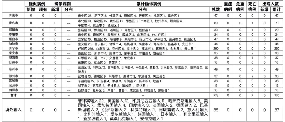 山東無新增本地疑似病例、確診病例。累計報告確診病例778例,死亡7例,治愈出院770例。正在住院治療的確診病例1例(省外輸入1例)。