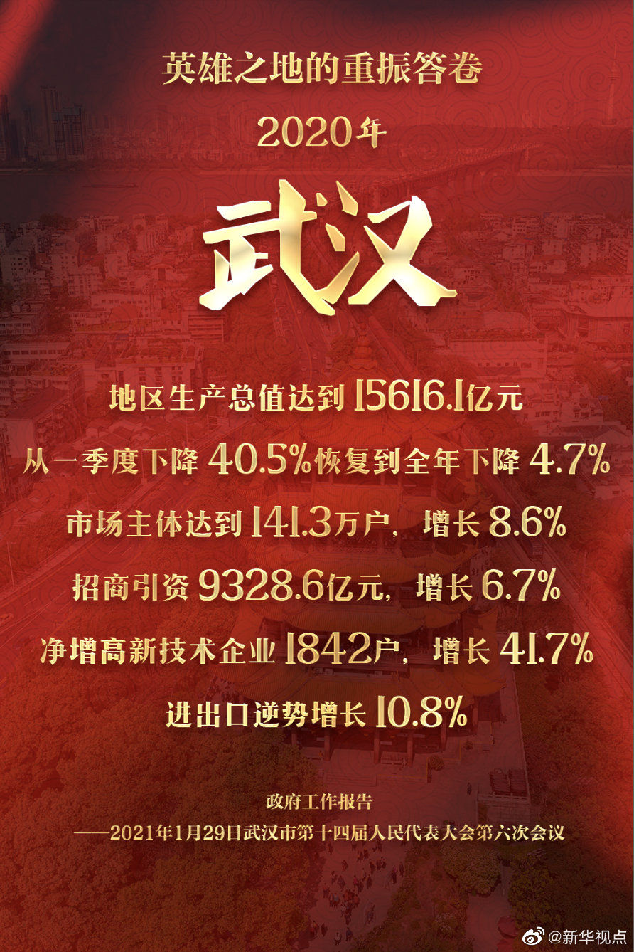 1月29日,在武漢市第十四屆人民代表大會第六次會議上,武漢市代市長程用文作政府工作報告。報告指出,作為封控時間最長、重啟時間最晚、疫情影響最大的城市,在一季度地區生產總值斷崖式下跌的情況下,武漢搏殺二季度,沖刺三季度,決戰四季度,全年好于預期,經濟總量位居全國城市前十,達到15616.1億元,同比下降4.7%,穩住了經濟基本盤。