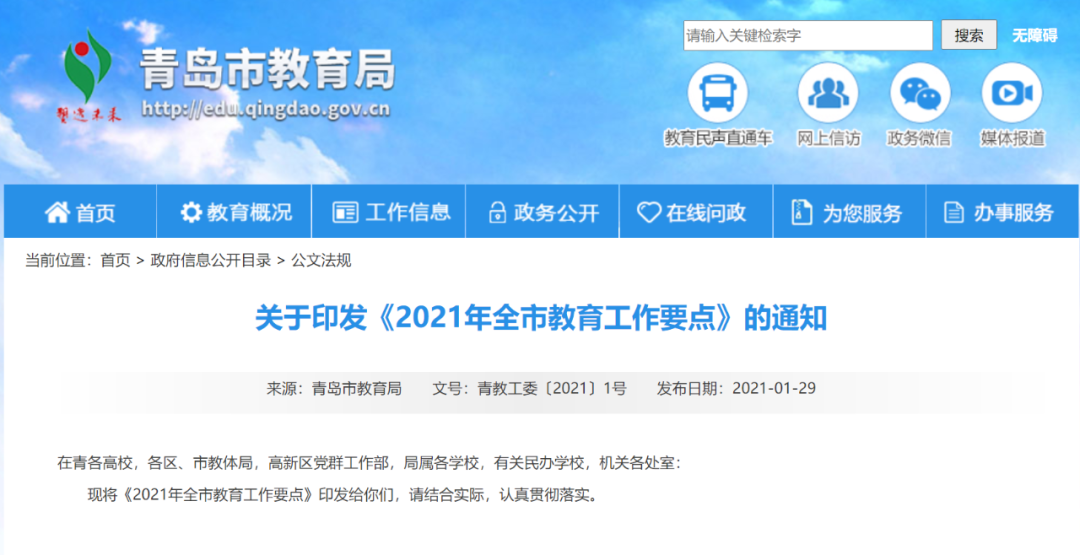 2021年,我市將印發《青島市“十四五”教育事業發展規劃》《青島市教育設施布局專項規劃》,研究制訂新一輪教育綜合改革方案,積極推動膠東五市教育教學交流、合作與資源共享。