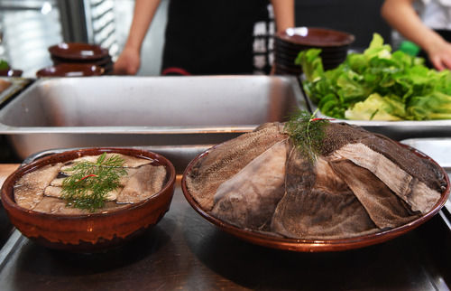 這是2020年10月5日在位于重慶來福士的一家老火鍋餐廳拍攝的小份(左)和大份毛肚菜品。