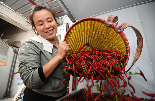 2020年9月27日,貴州省遵義市播州區新民鎮龍豐村的椒農陳本會準備烘干辣椒。