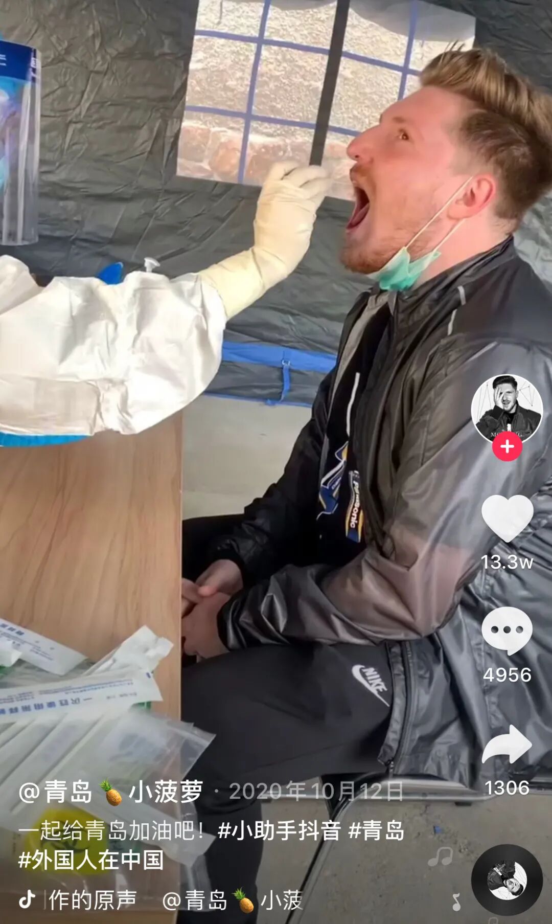 2020年10月11日,青島新增3例新冠肺炎無癥狀感染者。青島第一時間啟動全員核酸檢測。超1000萬人,120個小時,核酸檢測結(jié)果均為陰性。“超級快”,安東用三個字來形容他眼中的青島速度。他在網(wǎng)上分享了當時自己排隊做核酸檢測的經(jīng)歷,“我一點沒害怕,因為我知道現(xiàn)在全世界沒有比中國反應(yīng)更快,做得更好的了。”在視頻的結(jié)尾,他還向網(wǎng)友們熱情喊話,“等我們準備好了,歡迎大家繼續(xù)來青島,喝啤酒吃哈喇,看紅瓦綠樹,碧海藍天。”