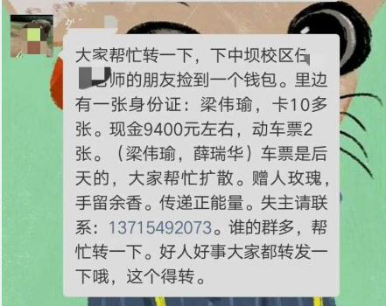 經常上網的人應該對這樣的句式并不陌生,逢年過節,無論是國慶還是春節,網上總會出現類似“xxx身份證丟了求擴散”、“xxx車票丟了”、“xxx錢包丟了”等信息,這些信息一般寫得有鼻子有眼,甚至還附上了聯系方式。