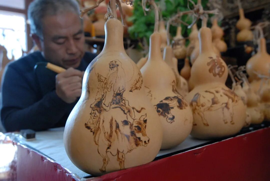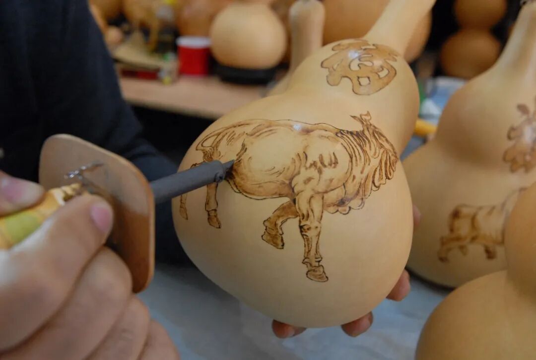 走進工作室映入眼簾的是琳瑯滿目、形態(tài)各異的葫蘆掛滿了整個房間,有福祿壽喜、山水人物,花鳥魚蟲等形形色色的圖案。這些惟妙惟肖的葫蘆烙畫作品,都是黃旭的得意之作。黃旭告訴記者,每到春節(jié),他都會烙制一些以生肖為主題的作品來表達對新一年的美好祝愿。今年關于生肖牛的烙畫達20多種,有“金牛納?!薄芭鉀_天”等。烙畫古稱“火針刺繡”,又叫“火筆畫”、“燙畫”等。