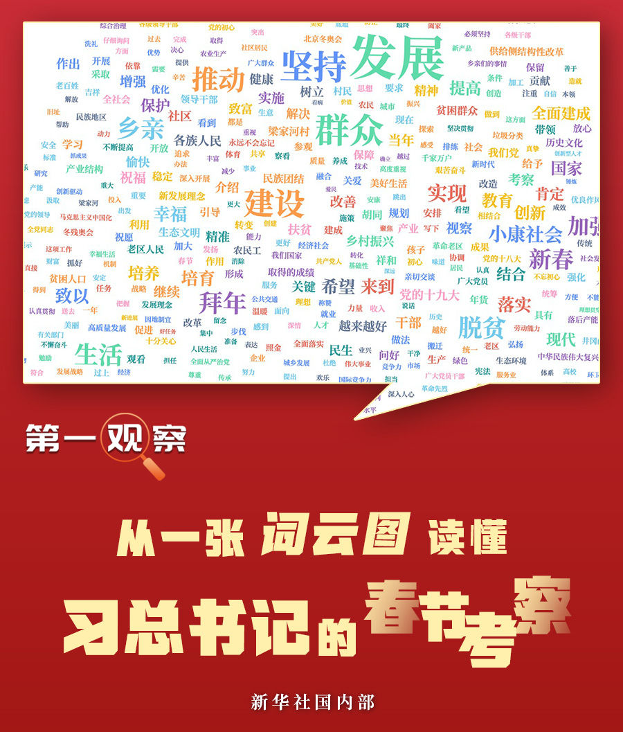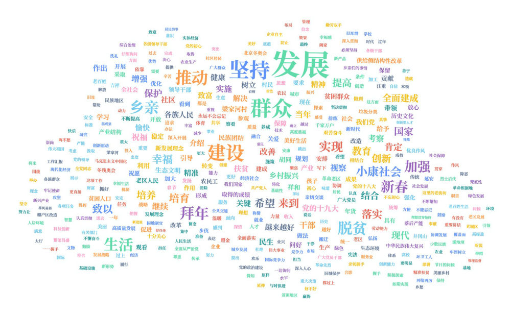 我們對十八大以來總書記春節考察的新聞報道做了統計分析。在呈現眼前的詞云圖上,“發展”“群眾”“建設”“鄉親”“小康社會”“脫貧”“創新”“生態文明”等成為“高頻詞”。這從一個側面反映了習近平總書記的關心、關注和關切。梳理這些高頻詞,可以觀察解讀出幾層深意——