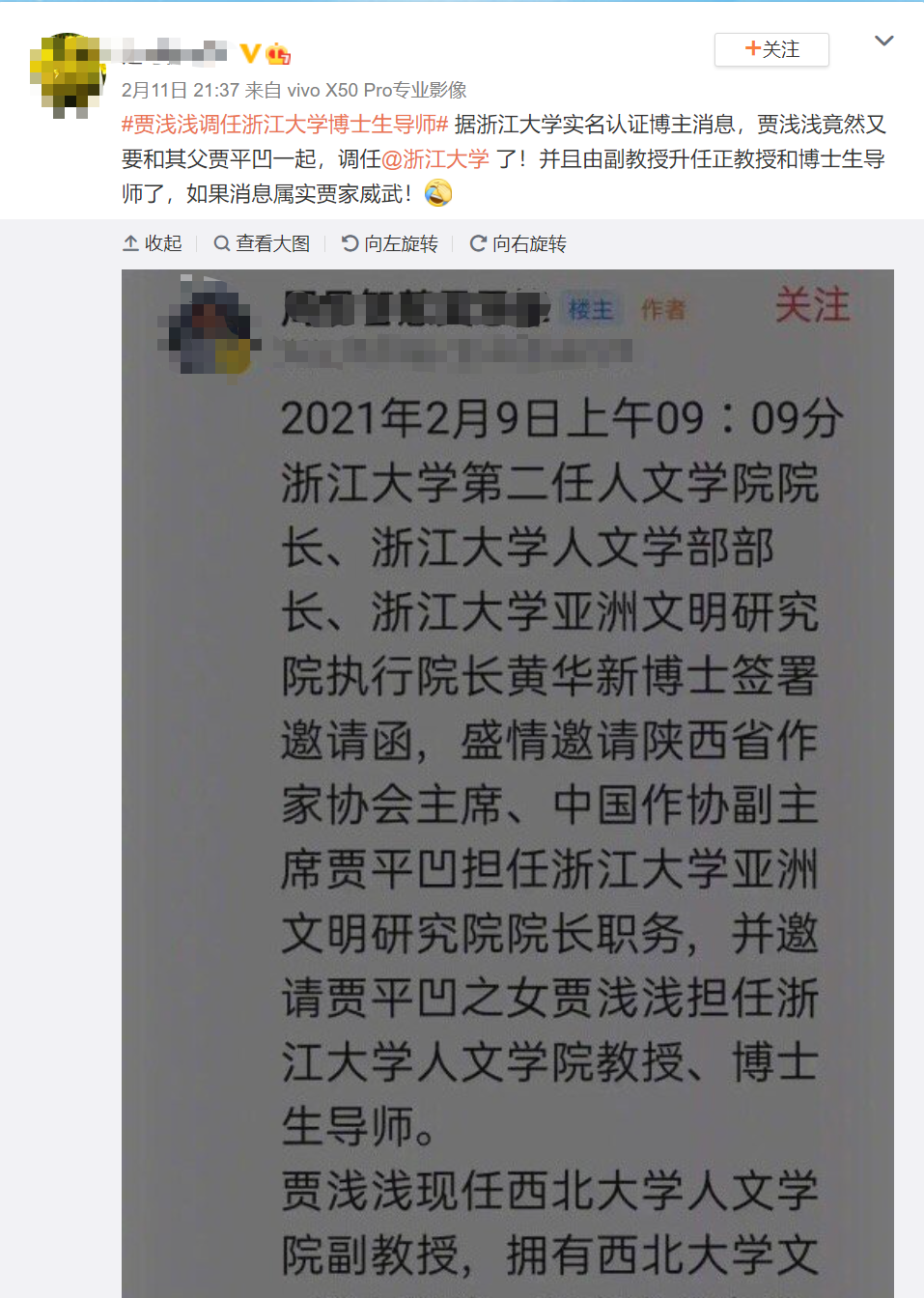 近日,有消息稱“賈平凹之女賈淺淺受邀擔任浙江大學人文學院教授、博導,賈平凹受邀擔任浙江大學亞洲文明研究院院長”。這一消息是否為真引發關注。