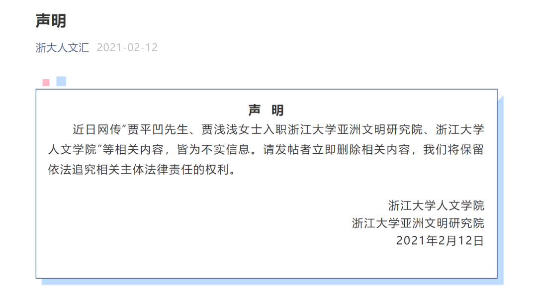 上述《聲明》稱,近日網傳“賈平凹先生、賈淺淺女士入職浙江大學亞洲文明研究院、浙江大學人文學院”等相關內容,皆為不實信息。請發帖者立即刪除相關內容,我們將保留依法追究相關主體法律責任的權利。
