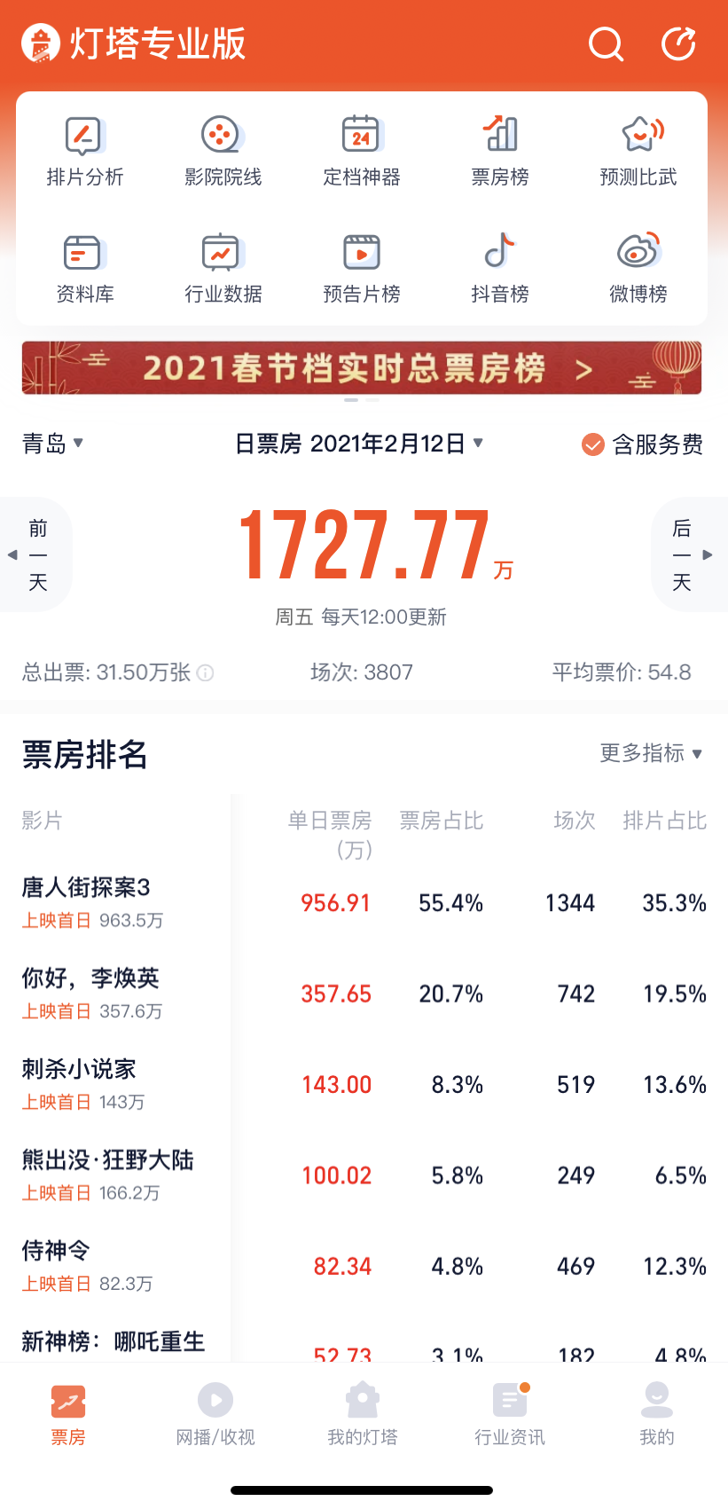 據(jù)燈塔專業(yè)版數(shù)據(jù)顯示,全市在業(yè)影城的票房一路攀升,最終定格在1727.77萬元(含服務(wù)費(fèi)),相比歷史最高的2019年大年初一1368.7萬元,增幅359萬元,僅增幅就相當(dāng)于2001年青島市全年電影票房。