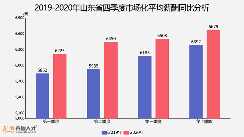 從上圖走勢來看,疫情給山東帶來的沖擊通過一季度市場化平均薪酬直觀反映出來,一季度山東省市場化平均薪酬全年最低,為6223元;二季度薪酬為6450元,上漲明顯;三四季度薪酬分別為6508元和6679元依舊持上漲態(tài)勢。就薪酬漲幅來看,2020年二季度創(chuàng)季度最高漲幅,薪酬同比2019年同期上漲515元。