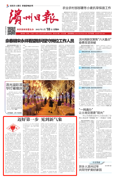 濱州日報刊發社論《邁好第一步 見到新氣象》。評論指出,全市廣大黨員干部職工要立即結束春節假期模式,迅速進入工作狀態,發揚“三牛”精神,全面開啟現代化富強濱州建設新征程。
