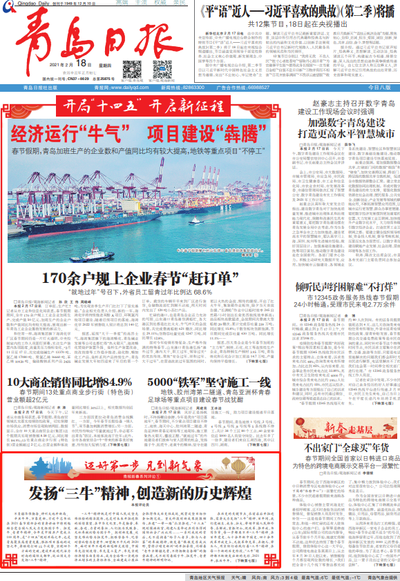 青島日報今日刊發“邁好第一步 見到新氣象”系列評論之一《發揚“三牛”精神,創造新的歷史輝煌》。