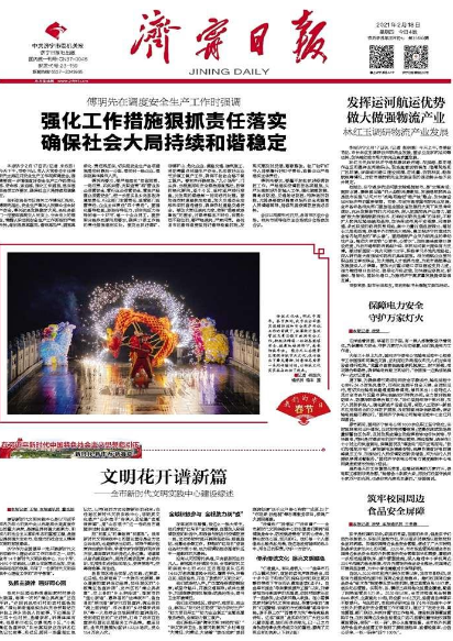 濟寧日報頭版頭條聚焦該市安全生產工作視頻調度會,在第二版轉發新華社評論《牛開豐穗景 雨動辛丑春》。