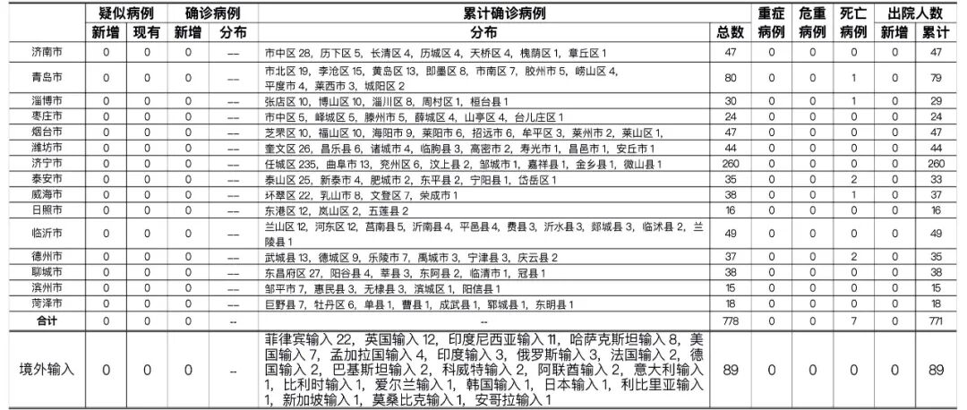 山東省本地病例按確診時醫院所在縣區統計,境外輸入病例單獨統計。