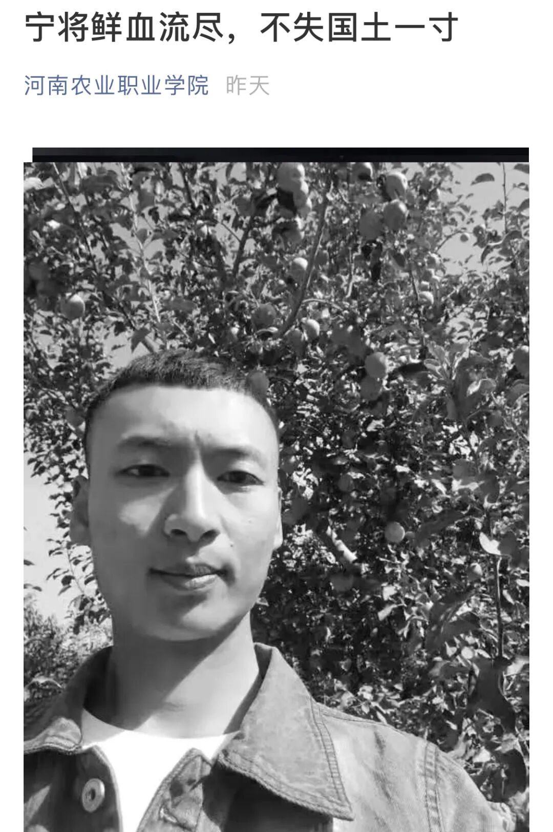 文中稱,河南農業職業學院2014級汽修3班學生肖思遠,在邊境沖突中誓死捍衛國土,被中央軍委追記一等功。青春熱血灑昆侖,赤膽忠誠只為國。大好河山,寸土不讓!河南農業職業學院全體師生,向英雄致敬!