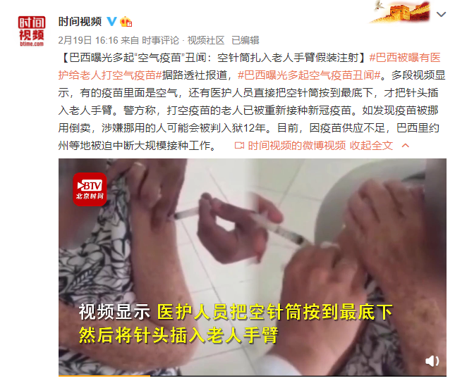 據路透社報道,巴西曝光多起空氣疫苗丑聞。多段視頻顯示,有的疫苗里面是空氣,還有醫護人員直接把空針筒按到最底下,才把針頭插入老人手臂。警方稱,打空疫苗的老人已被重新接種新冠疫苗。如發現疫苗被挪用倒賣,涉嫌挪用的人可能會被判入獄12年。目前,因疫苗供應不足,巴西里約州等地被迫中斷大規模接種工作。
