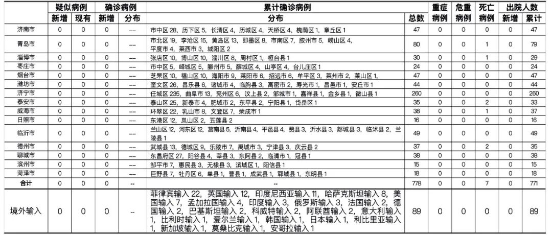 山東無新增境外輸入疑似病例、確診病例。累計報告境外輸入確診病例89例,治愈出院89例。