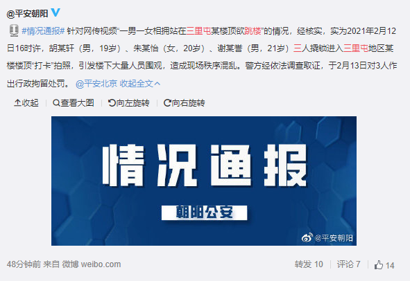 針對網(wǎng)傳視頻“一男一女相擁站在三里屯某樓頂欲跳樓”的情況,經(jīng)核實,實為2021年2月12日16時許,胡某軒(男,19歲)、朱某怡(女,20歲)、謝某譽(男,21歲)三人撬鎖進入三里屯地區(qū)某樓樓頂“打卡”拍照,引發(fā)樓下大量人員圍觀,造成現(xiàn)場秩序混亂。警方經(jīng)依法調(diào)查取證,于2月13日對3人作出行政拘留處罰。