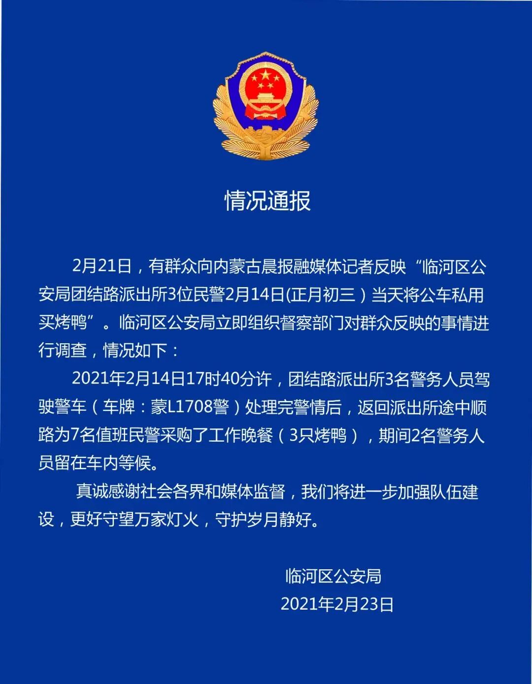 “臨河公安”微信23日發布情況通報稱,2月21日,有群眾向內蒙古晨報融媒體記者反映“臨河區公安局團結路派出所3位民警2月14日(正月初三)當天將公車私用買烤鴨”。臨河區公安局立即組織督察部門對群眾反映的事情進行調查,情況如下: