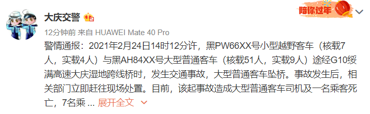 警情通報:2021年2月24日14時12分許,黑PW66XX號小型越野客車(核載7人,實載4人)與黑AH84XX號大型普通客車(核載51人,實載9人)途經(jīng)G10綏滿高速大慶濕地跨線橋時,發(fā)生交通事故,大型普通客車墜橋。事故發(fā)生后,相關(guān)部門立即趕往現(xiàn)場處置。目前,該起事故造成大型普通客車司機(jī)及一名乘客死亡,7名乘客受傷,正在醫(yī)院進(jìn)行救治,具體事故原因正在調(diào)查中。