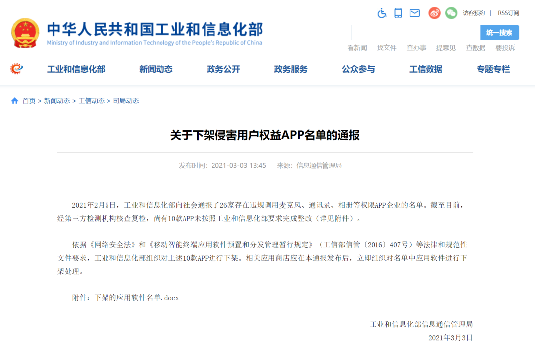 據工信部通報,2月5日,工信部向社會通報了26家存在違規調用麥克風、通訊錄、相冊等權限APP企業的名單。截至目前,經第三方檢測機構核查復檢,尚有10款APP未按照我部要求完成整改(詳見附件)。依據網絡安全法和《移動智能終端應用軟件預置和分發管理暫行規定》(工信部信管〔2016〕407號)等法律和規范性文件要求,工信部組織對上述10款APP進行下架。相關應用商店應在本通報發布后,立即組織對名單中應用軟件進行下架處理。