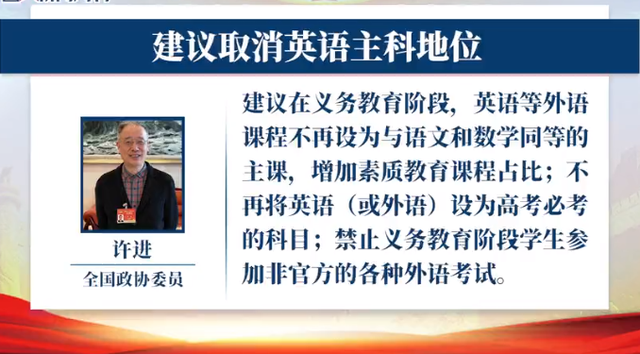 “在義務教育階段,英語等外語課程不再設為與語文和數學同等的主課,增加素質教育課程占比;不再將英語(或外語)設為高考必考的科目;禁止義務教育階段學生參加非官方的各種外語考試。”許進說。