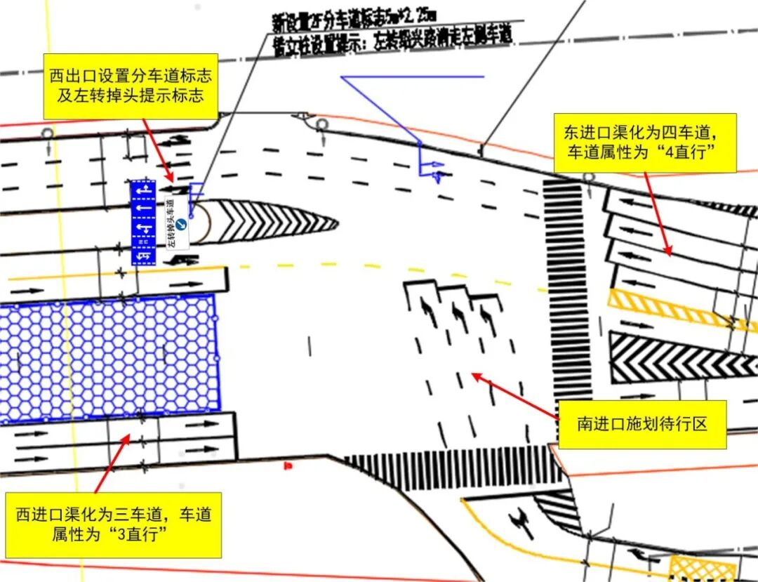 (3)南進(jìn)口施劃左轉(zhuǎn)待行區(qū),渠化為“3左轉(zhuǎn)”,增加蓄車空間;