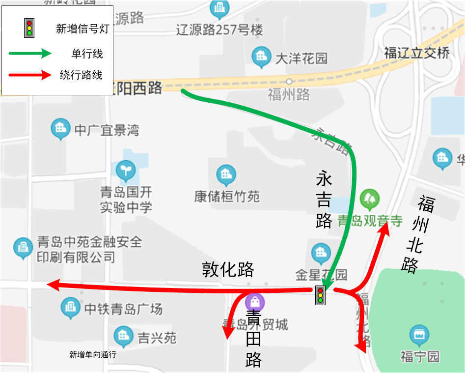 (1)永吉路由南向北單行線調(diào)整為北向南單行,車輛可選擇福州路或沿敦化路向西繞行;