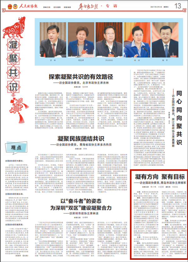 楊軍:政協擔負凝聚共識的政治責任,必須做到凝有方向、聚有目標,切實把社會各界的共識與力量凝聚到習近平總書記科學擘畫的宏偉藍圖上,凝聚到從中央到地方“十四五”發展規劃和2035年遠景目標上,凝聚到黨中央全面建設社會主義現代化國家決策部署上,在習近平新時代中國特色社會主義思想的旗幟下團結奮斗、奮勇前進。青島市政協積極響應市委號召,在深入開展的“愛青島,讓青島更美好”主題履職行動中,緊緊圍繞習近平總書記對青島工作的重要指示要求,聚焦“十四五”高質量發展“六個率先走在前列”,動員社會各界百川赴海、聚力同行,為“搞活一座城”、加快建設現代化國際大都市凝聚共識和力量。