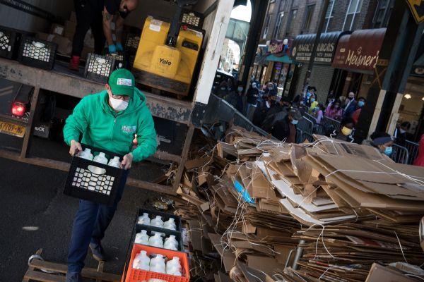 資料圖:在美國紐約一個食品發放點,工人搬運免費發放的牛奶。(新華社)