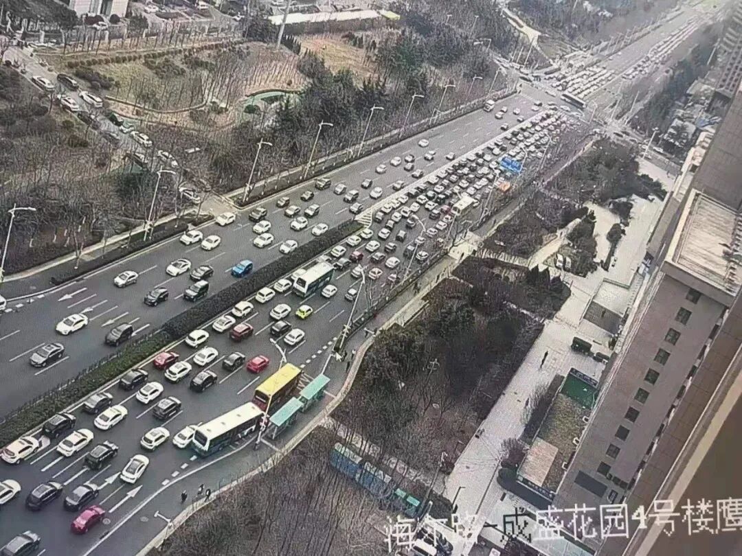 早晨八點多,海爾路西側(cè)的成盛花園頂部攝像頭,拍攝到海爾路北向南的車道。