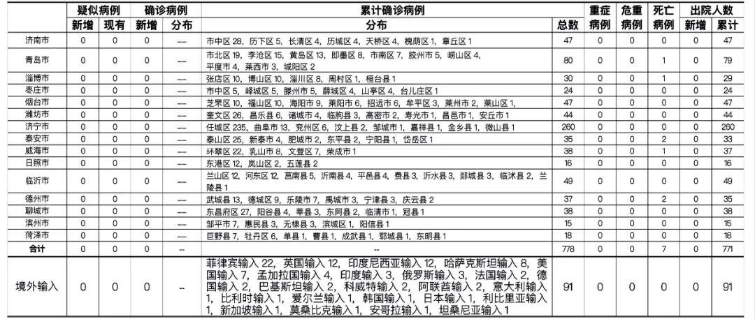山東無新增本地疑似病例、確診病例。累計報告確診病例778例,死亡7例,治愈出院771例。