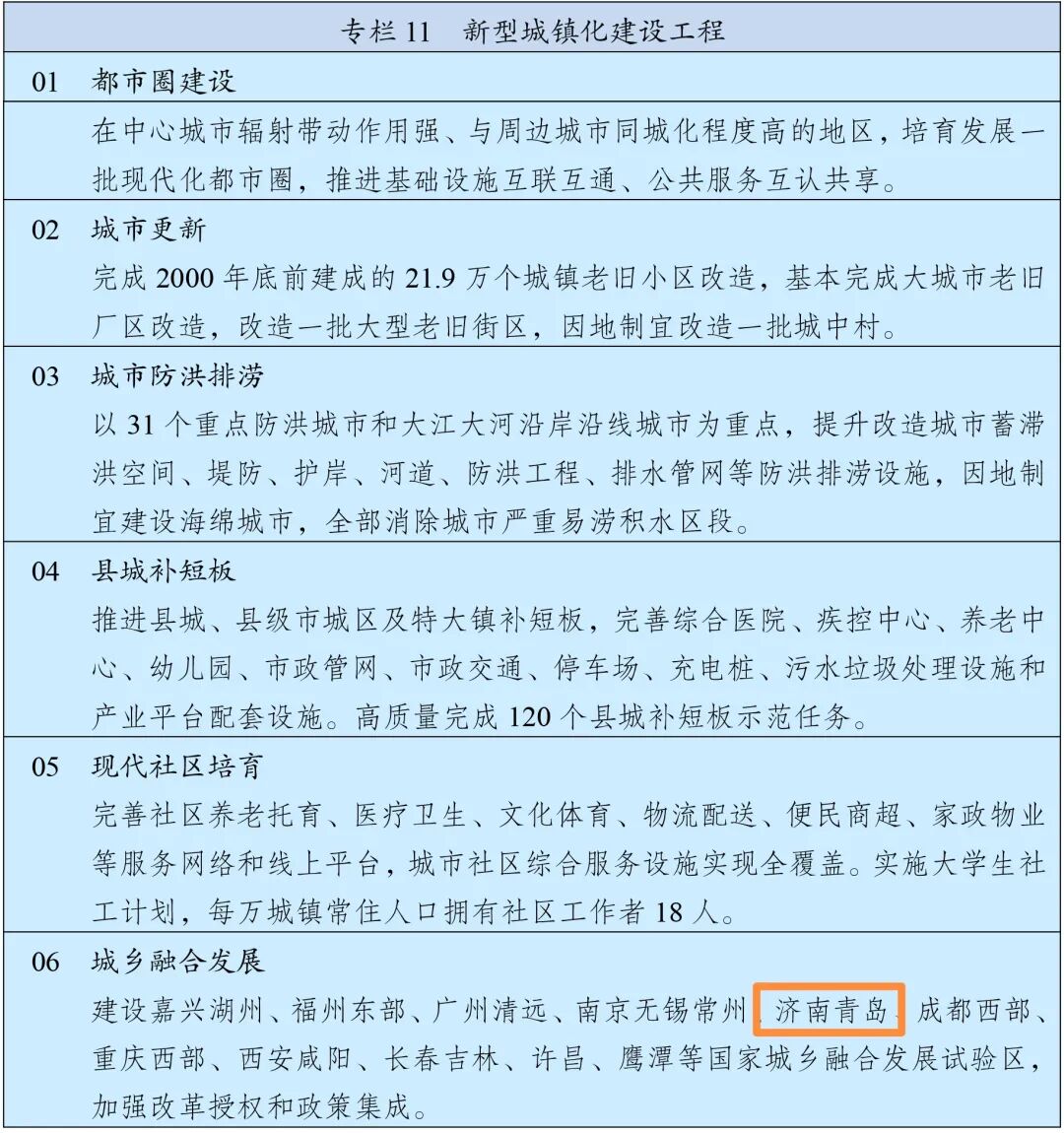 《綱要》第八篇對“完善新型城鎮化戰略 提升城鎮化發展質量”進行了部署,在“專欄11 新型城鎮化建設工程”中,“點名”青島:“建設濟南青島等國家城鄉融合發展試驗區,加強改革授權和政策集成。”
